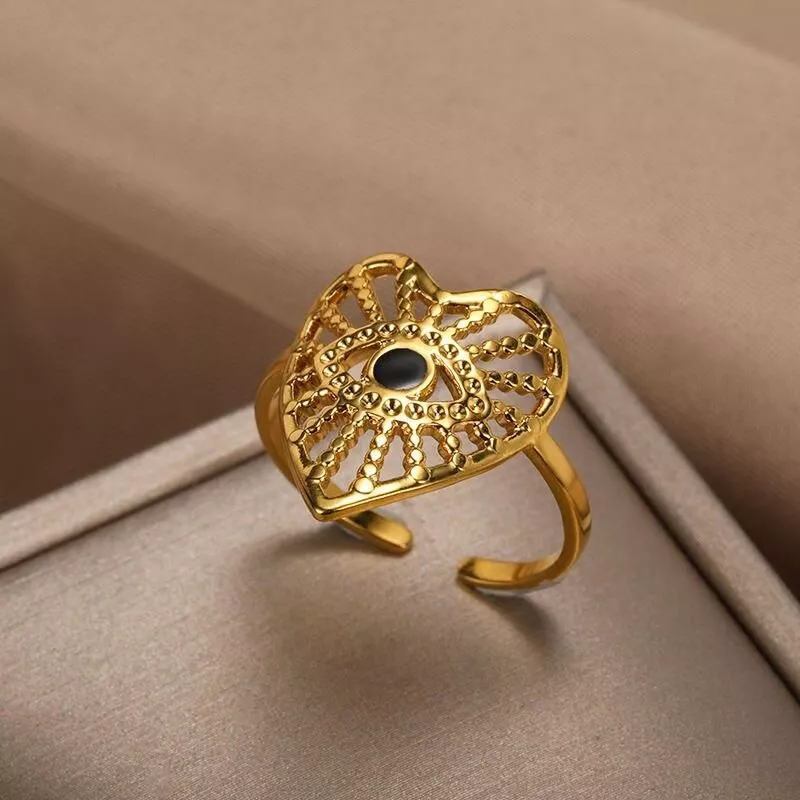 Discover the perfect blend of beauty, durability, and mystique with our Gold Color Adjustable Turkish Evil Eye Heart Ring. Crafted from high-quality stainless steel and finished with a vacuum electroplating process, this exquisite piece of jewelry is designed to stand the test of time, both in style and color. Whether you’re dressing up for a party or accessorizing for a casual day out, this ring adds a touch of elegance and protective charm to your ensemble.